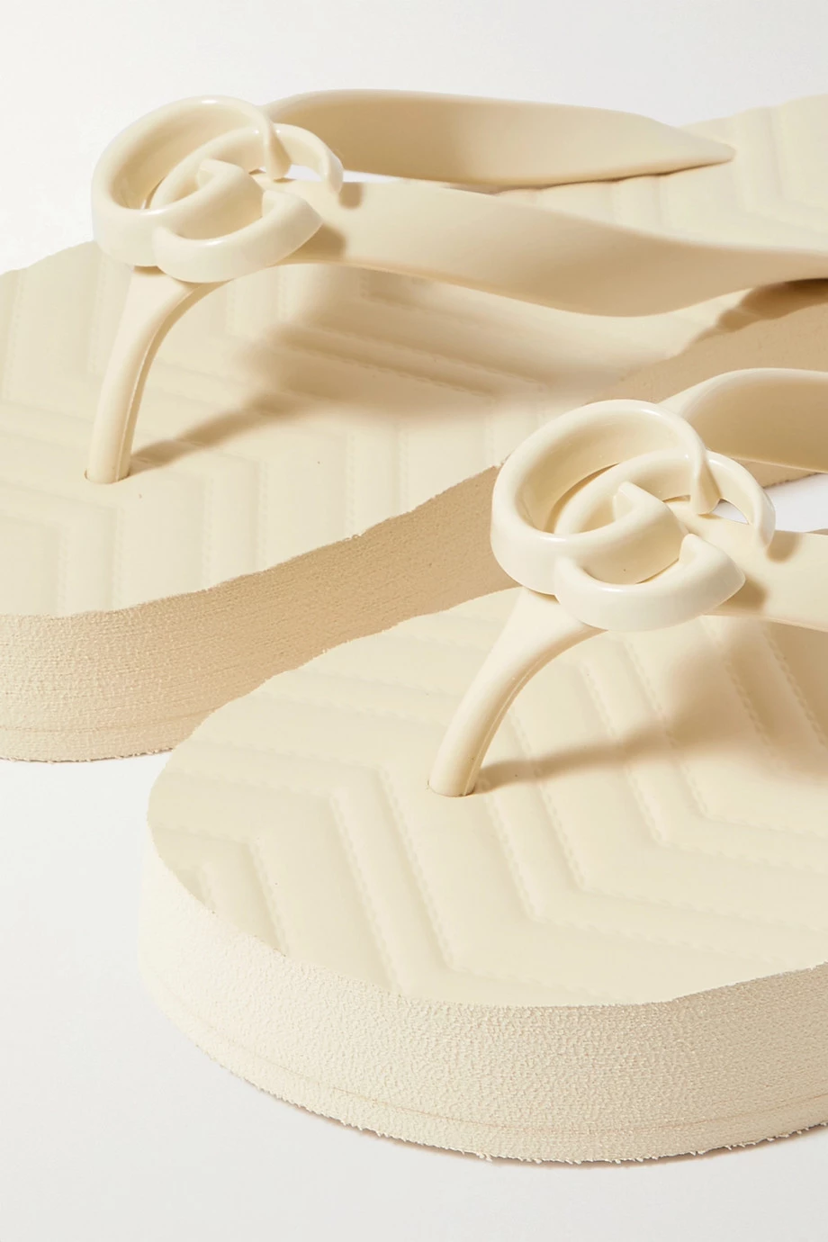 Die geprägte Innensohle der „Pascar“ Zehensandalen von Gucci erinnert an das zickzackförmige Steppmuster, das man von den „GG Marmont“ Taschen und Accessoires der Marke kennt. Das Paar aus Gummi wirkt aufgrund des Plateaus wie ein 90er-Jahre-Modell und hat eine Logoverzierung in Form der Initialen des Hauses, die aus glänzendem Harz besteht. Es passt genauso gut zu abgeschnittenen Jeansshorts wie zu Midikleidern.