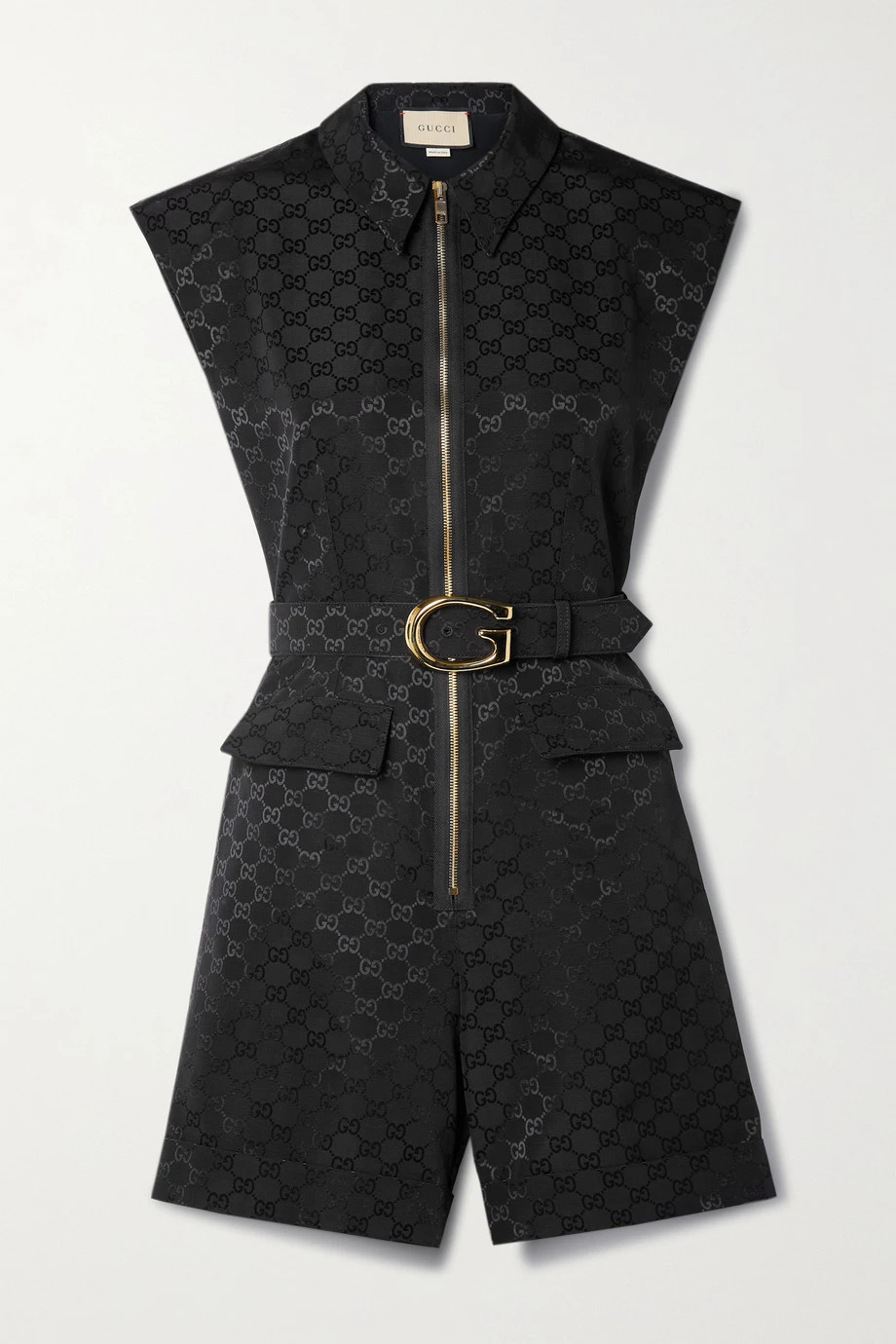 Dieser Playsuit von Gucci zeigt sich mit einem farblich abgestimmten „GG“-Logomuster sowie einer goldglänzenden Schnalle in Form der Initiale – die ikonischen Markenzeichen gehören schon seit den 70er-Jahren zu dem Haus. Der in Italien gefertigte Einteiler aus Jacquard aus einer Baumwollmischung hat eine taillierte Form und ein leicht lockeres Bein mit umgeklapptem Abschluss.