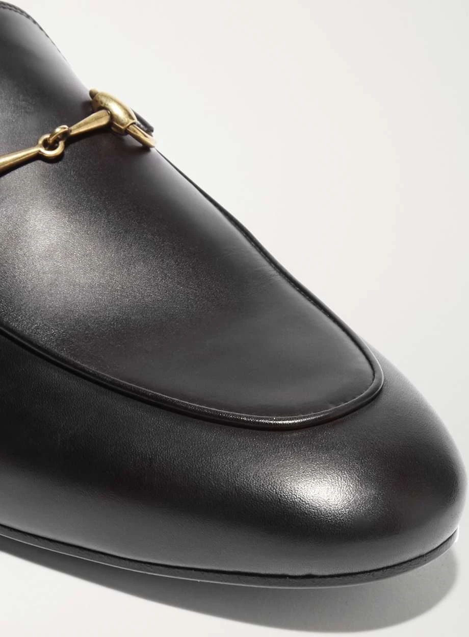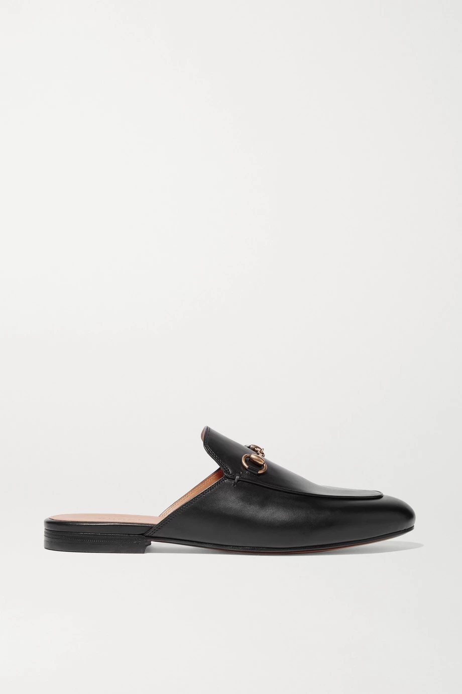 Tauschen Sie Ihre Loafers in diesem Frühjahr gegen diese schicken Slippers von Gucci ein. Sie wurden in Italien aus schwarzem Glattleder gefertigt und mit dem ikonischen „Horsebit“-Detail des Hauses vollendet. Das Paar mit mandelförmiger Kappe ist für das Büro und abendliche Verabredungen geeignet.