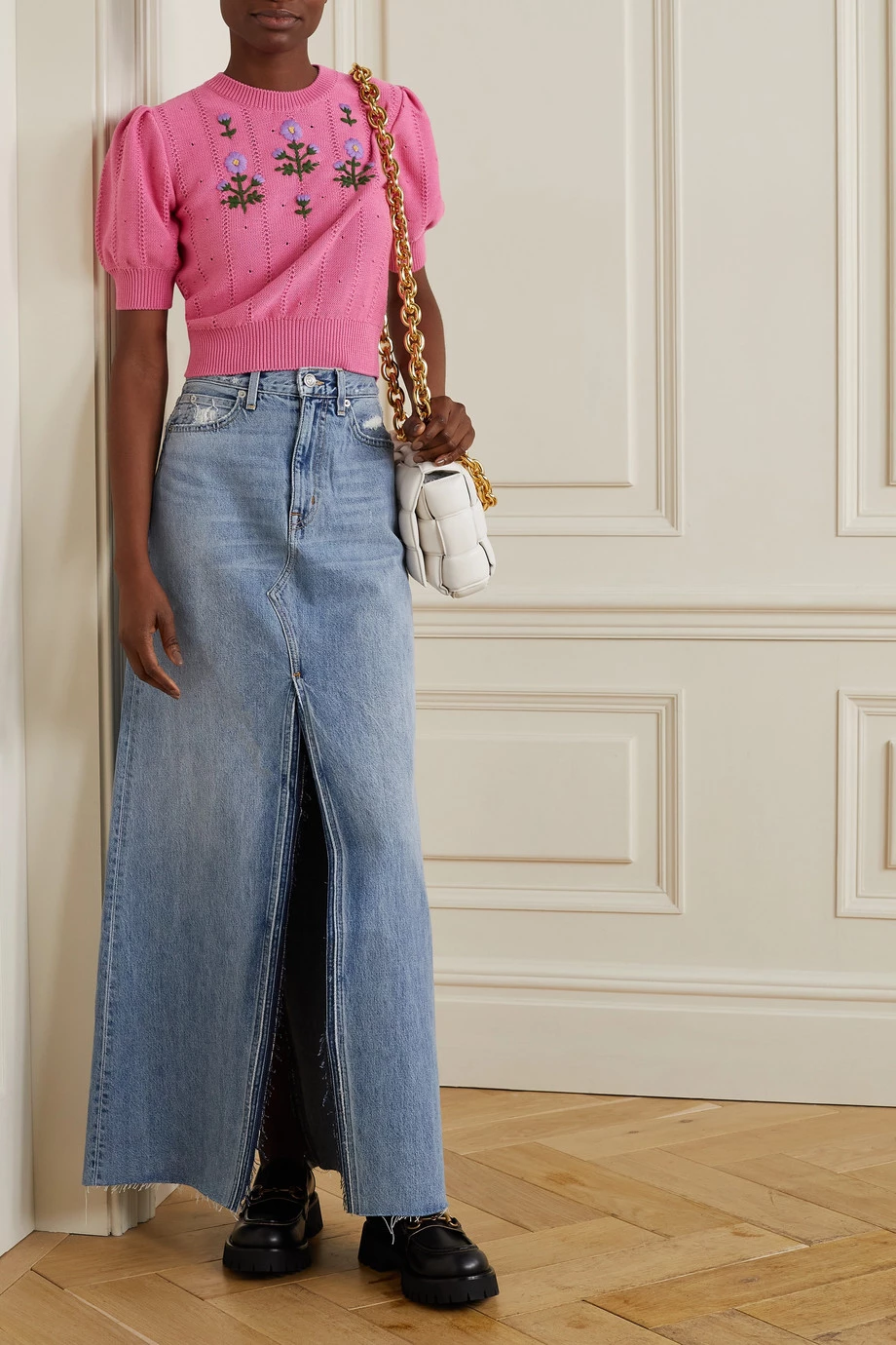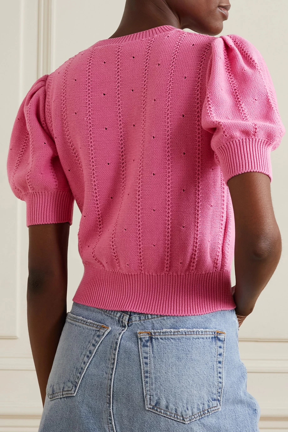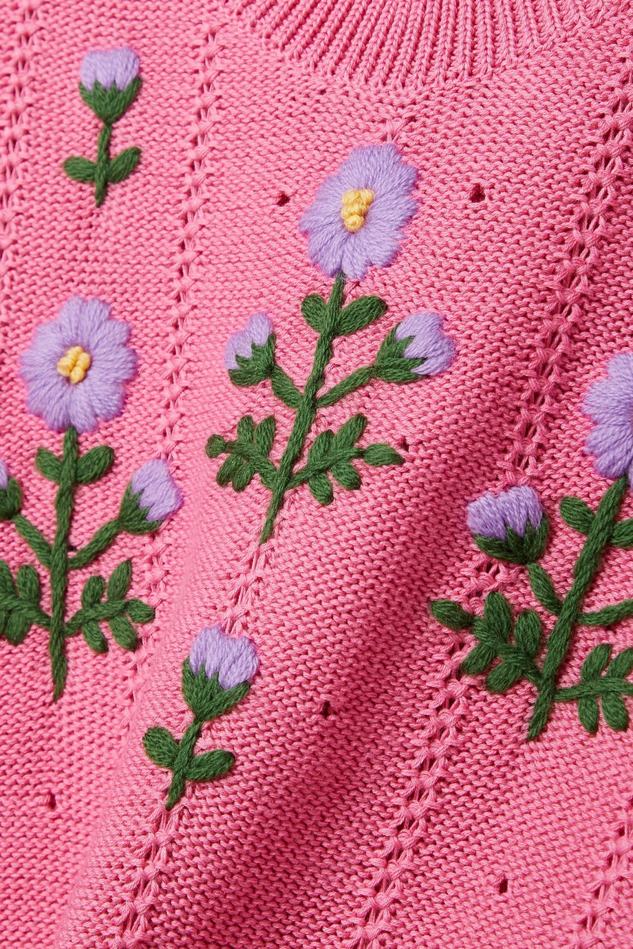 Dieser Pullover stammt aus der „Ouverture“ Kollektion von Gucci, die in Anlehnung an handgearbeitete Vintage-Kleidung entstand. Das Modell wurde in Italien aus einer weichen Baumwoll-Seidenmischung in Pointelle-Strick gefertigt und mit farbenfrohen Blüten bestickt. Zudem sorgen Puffärmel für romantisches Flair.