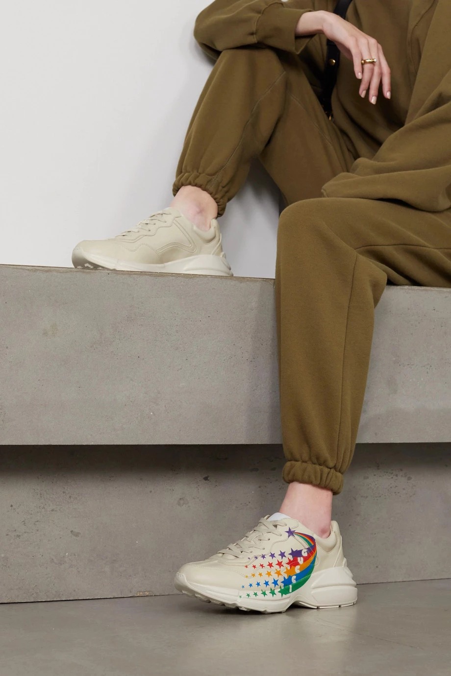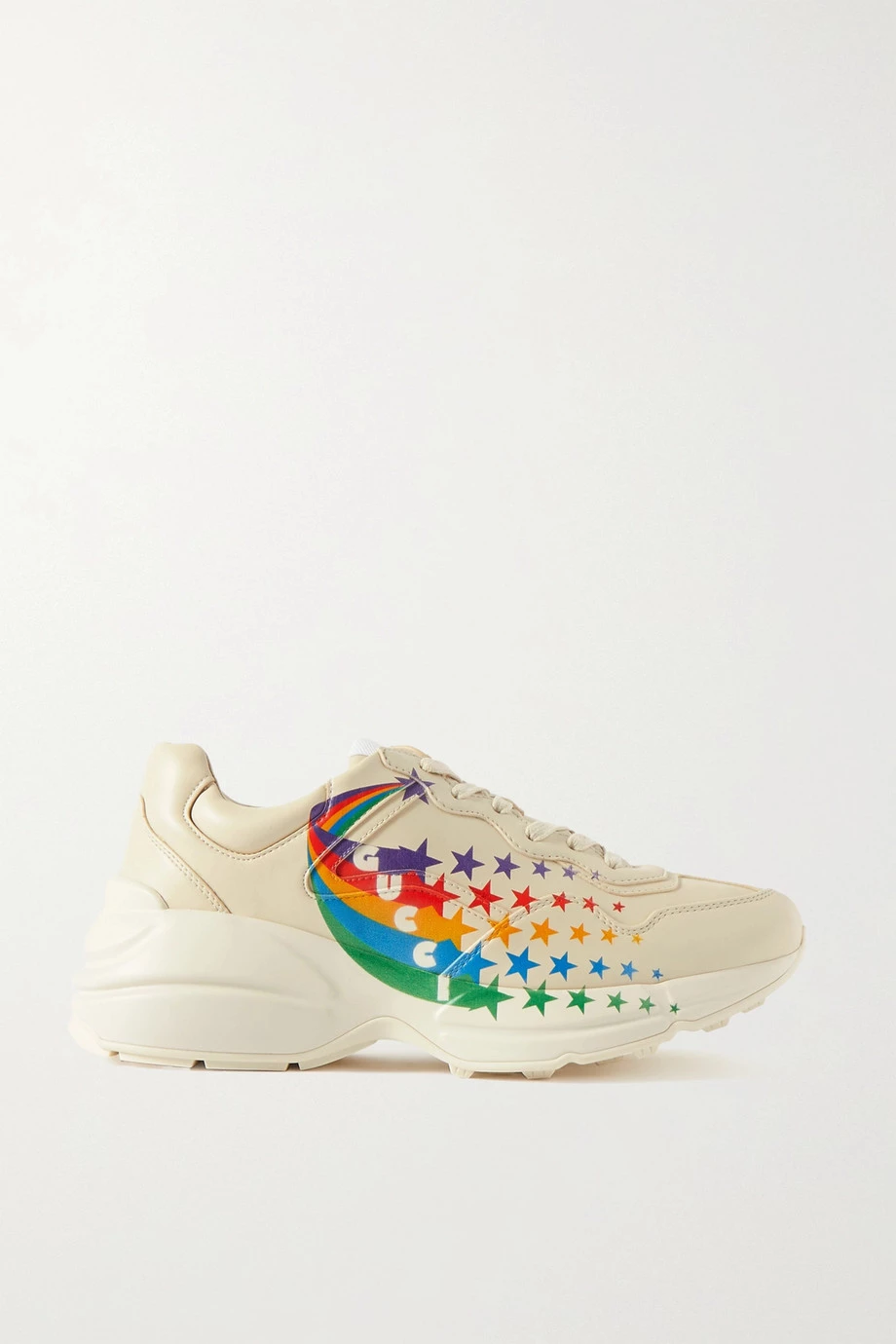 Die „Rhyton“ Sneakers von Gucci sind seit ihrer Einführung im Jahre 2018 ausgesprochen beliebt, weshalb die Marke immer wieder neue Ausführungen in unterschiedlichen Farben herausbringt. Diese Version mit bunten Sternschnuppen wurde in Italien aus cremeweißem Leder gefertigt und mit einer hohen Gummisohle im Stil der 90er-Jahre versehen. Stimmen Sie Ihre Socken auf eine der Regenbogenfarben ab.