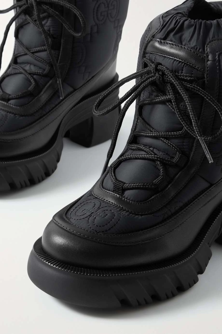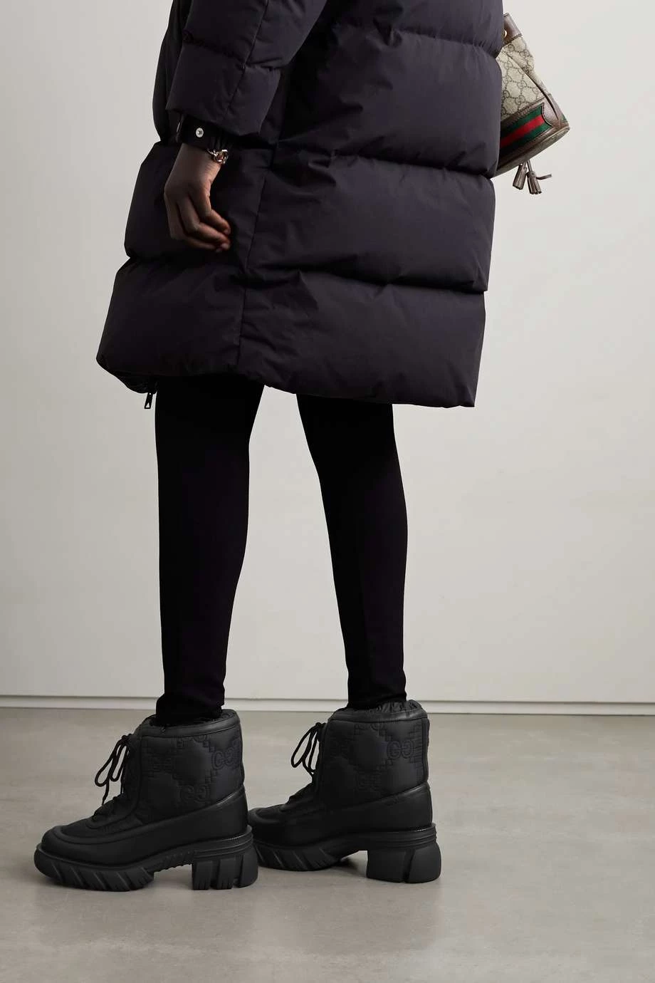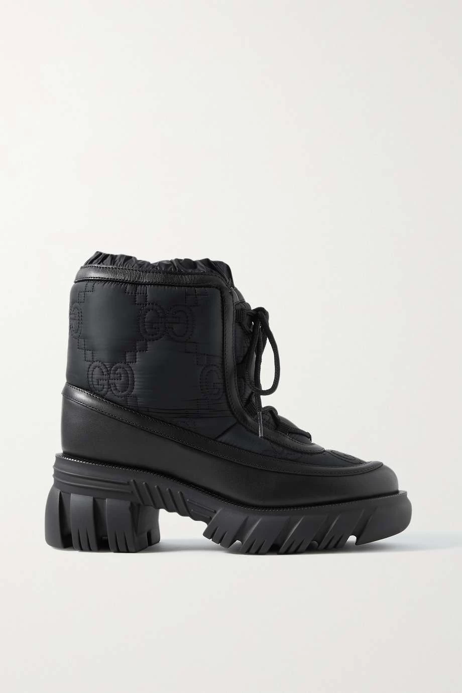 Die „Romance“ Schnürstiefel von Gucci wurden in Italien aus Shell mit Logostickereien gefertigt und mit Lederbesätzen gestaltet. Das Paar mit dicker Gummisohle bietet optimal Halt auf nassem Untergrund und verhindert dank des elastischen Abschlusses das Eindringen kalter Luft.