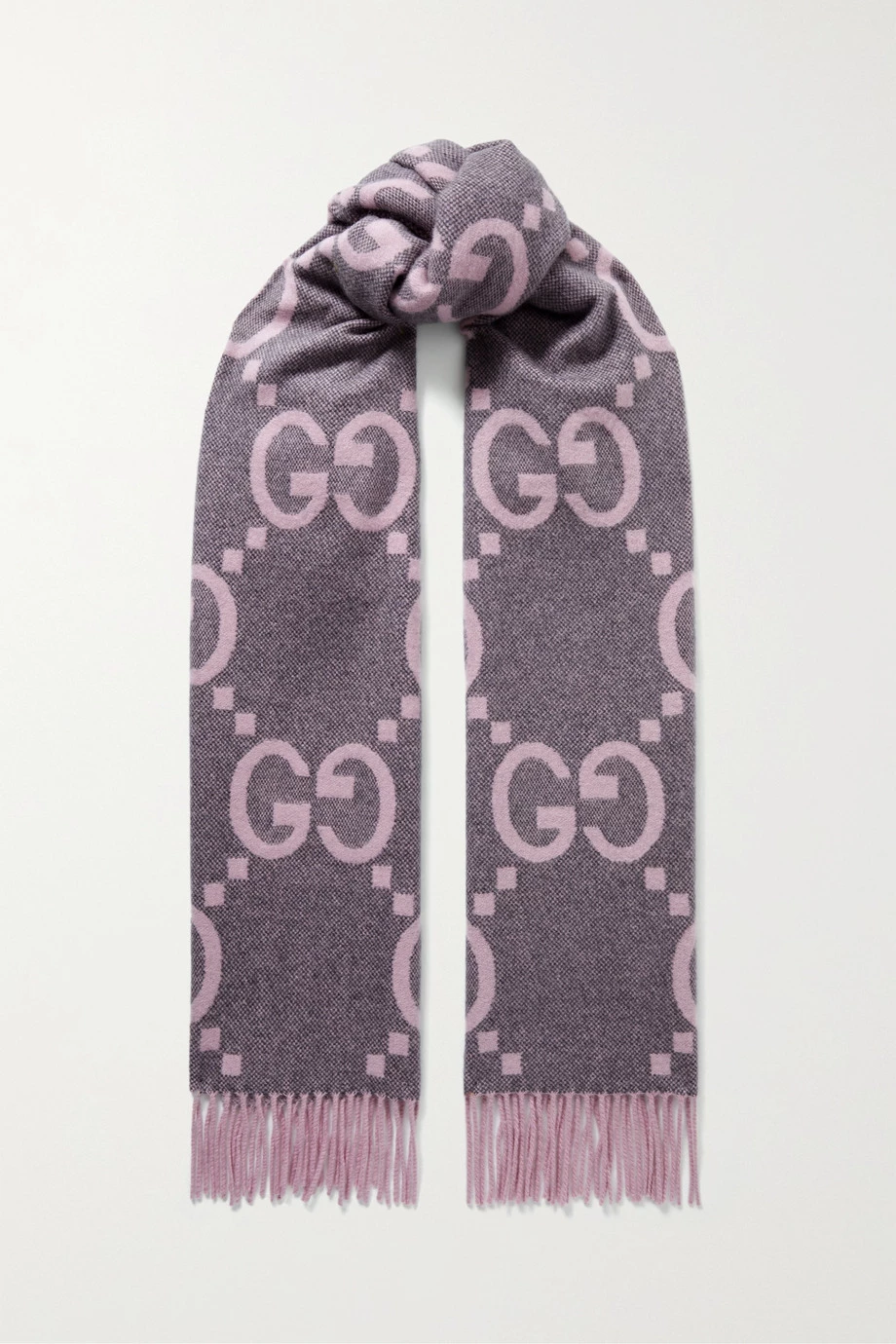 Dieser Schal von Gucci wurde in Italien aus warmem, weichem Kaschmir gefertigt, der sich mit einem Jacquard-Muster aus dem „GG“-Motiv des Hauses in Flieder und Grautönen zeigt. Das Modell hat Fransen an den Abschlüssen und gefällt uns mit der passenden Beanie.