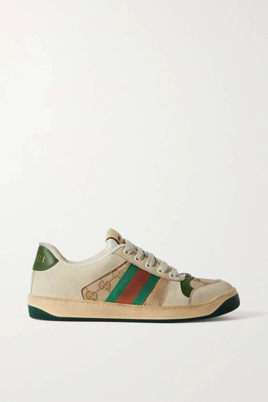 Die perforierten „Screener“ Sneakers von Gucci sind nach einer Taktik im Basketball benannt und an Sportschuhe aus den 70er-Jahren angelehnt – aufgrund der Distressed-Optik könnte man meinen, das Paar stamme tatsächlich aus dieser Zeit. Sie wurden in Italien aus Leder und Veloursleder gefertigt und neben dem charakteristischen Webstreifen des Hauses mit Logodetails verziert.