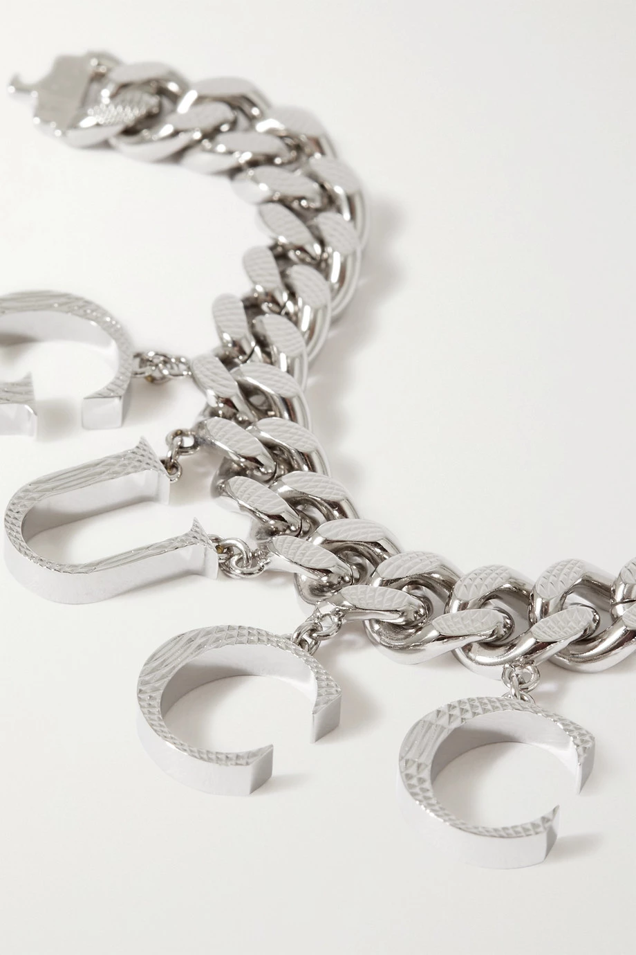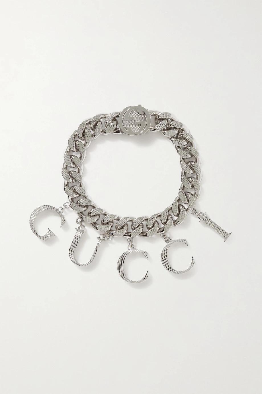 Dieses silberfarbene Armband von Gucci ist mit großen Buchstaben verziert, die den Namen des Hauses bilden – jene baumeln an markanten flachen Gliedern, deren eingraviertes Schlangenmuster auch an den einzelnen Anhängern zu sehen ist. Der Achterverschluss zeigt sich in Form des ineinandergreifenden „GG“-Emblems.