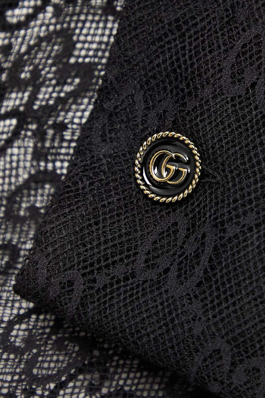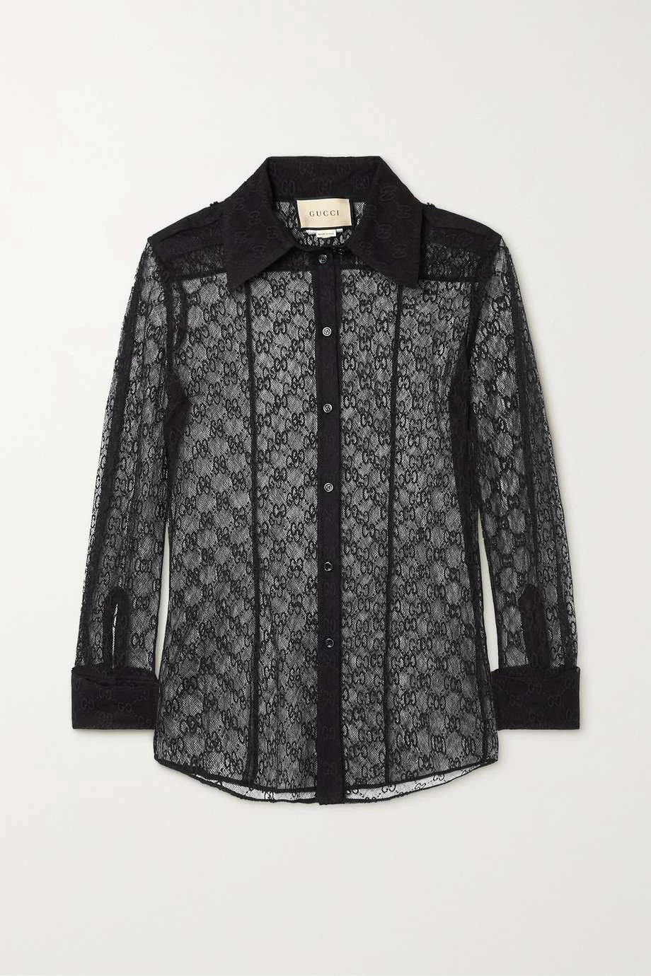 Dieses Hemd stammt aus der „Aria“ Kollektion von Gucci, welche den 100. Geburtstag der Marke feiert. Es wurde aus zarter Spitze aus einer Baumwollmischung gefertigt, in der sich das „GG“-Logo des Hauses findet, und ist durchscheinend, weshalb wir empfehlen, einen BH oder ein Top in passender Farbe darunterzuziehen.