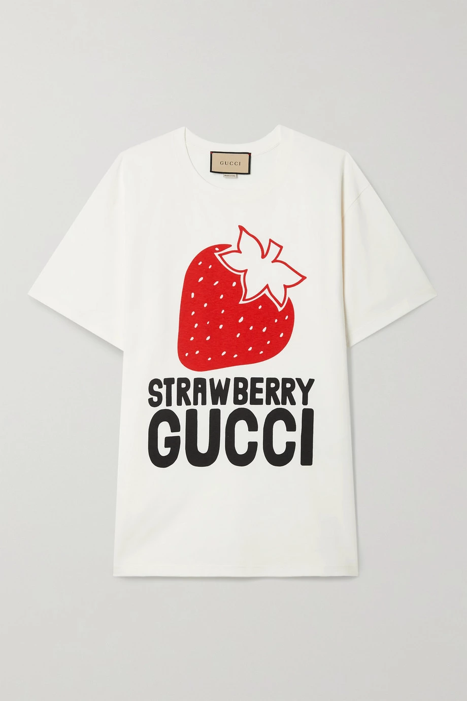 Verspielte Fruchtmotive haben sich mit der Zeit zu einem Markenzeichen von Gucci entwickelt. Dieses Oversized-T-Shirt mit klassischem Rundhalsausschnitt wurde in Italien aus Baumwoll-Jersey gefertigt und mit einer Erdbeere bedruckt. Uns gefallen Jeans und Blazer am besten dazu.