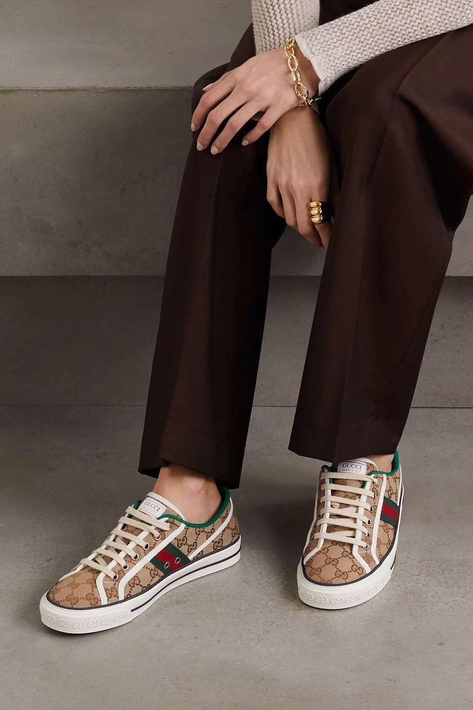 Als Vorlage für die „Tennis 1977“ Sneakers dienten Gucci – wie so oft – Designs aus dem umfangreichen markeneigenen Archiv, was sich neben dem Aufnäher an der Zunge auch an den charakteristischen Webstreifen des Hauses und dem Logomuster erkennen lässt. Das in Italien gefertigte Paar aus Canvas ruht auf einer Gummisohle mit grünen Streifen, die perfekt zum Futter des Modells passen.