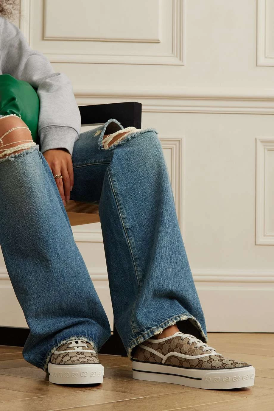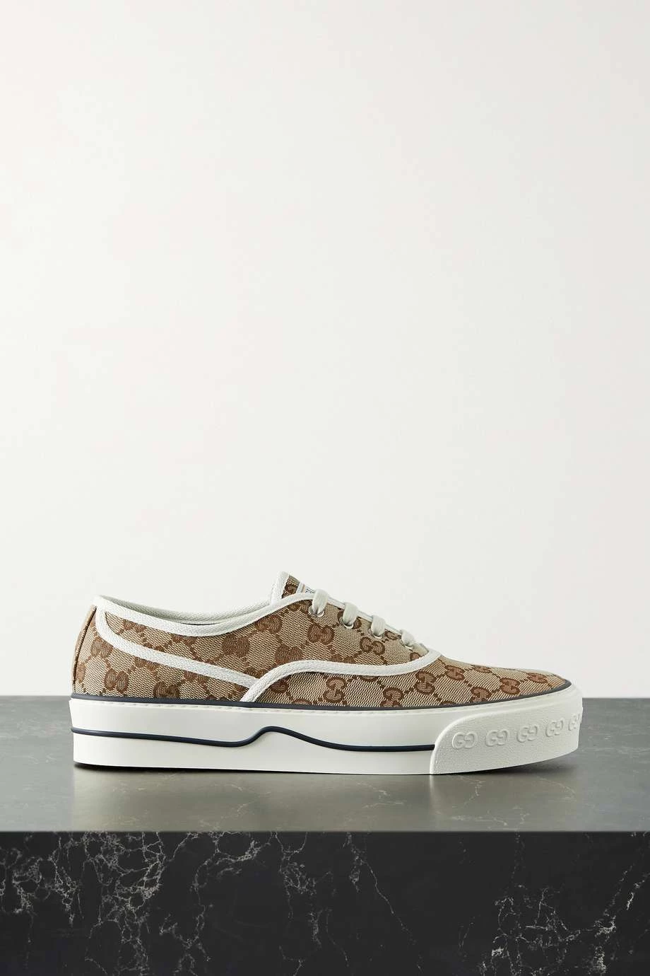 Als Vorlage für die „Tennis 1977“ Sneakers dienten Gucci – wie so oft – Designs aus dem umfangreichen markeneigenen Archiv, was sich neben dem Aufnäher an der Zunge auch an dem Logomuster erkennen lässt. Das in Italien gefertigte Paar aus Canvas ruht auf einer Gummisohle mit schwarzen Streifen.