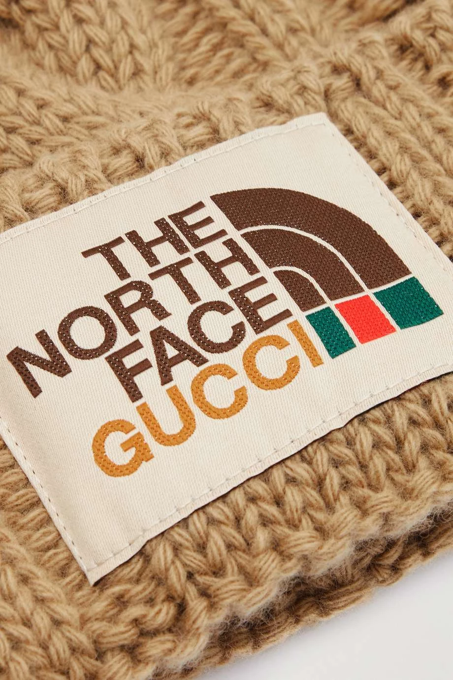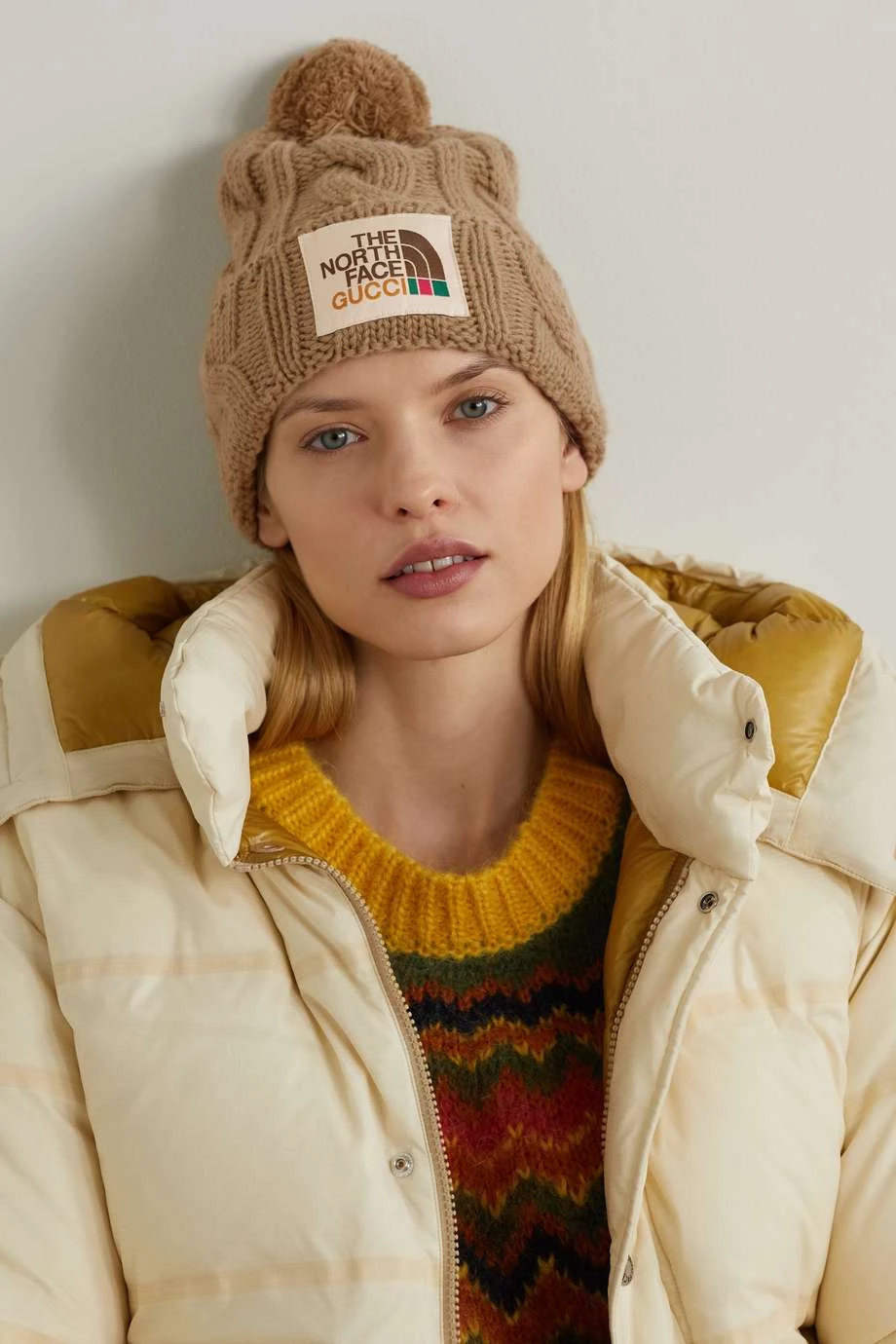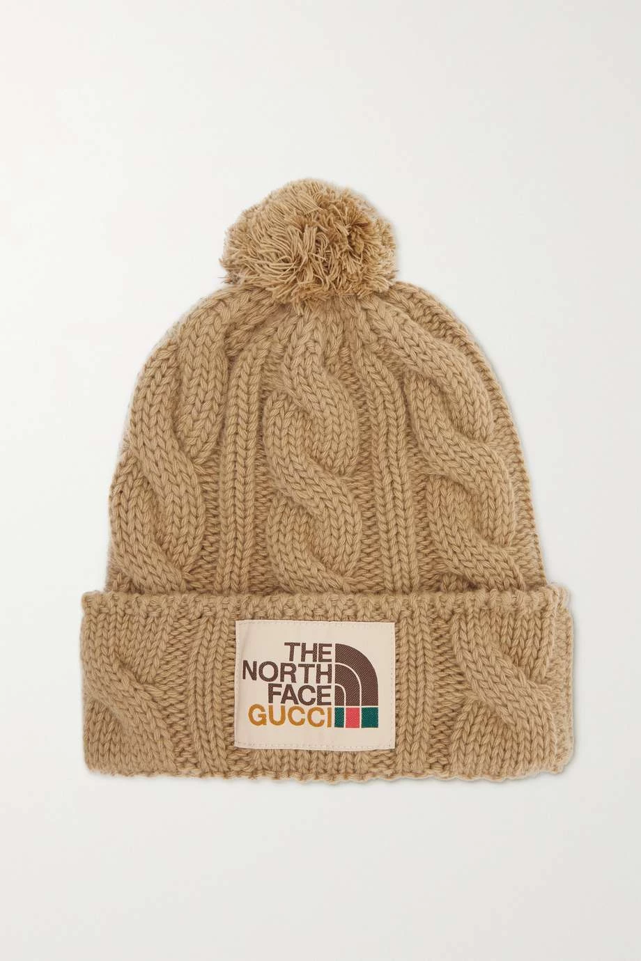 Diese Beanie entstammt einer Zusammenarbeit von Gucci und The North Face und ist dementsprechend funktionell sowie kuschelig. Das Accessoire mit flauschigem Pompon wurde in Italien aus wärmender Wolle in Zopfstrick gefertigt und am umgeschlagenen Abschluss mit einem Aufnäher gestaltet, auf dem das gemeinsame Logo der Marken zu sehen ist.