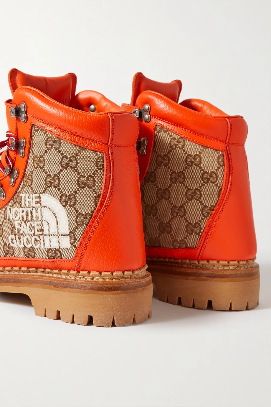 An den Modellen, die Gucci gemeinsam mit The North Face entwarf, führt kein Weg vorbei. Diese Schnürstiefel, die an Wanderschuhe aus dem Archiv angelehnt sind, wurden aus Canvas mit Logomuster und Leder in leuchtendem Orange gefertigt.