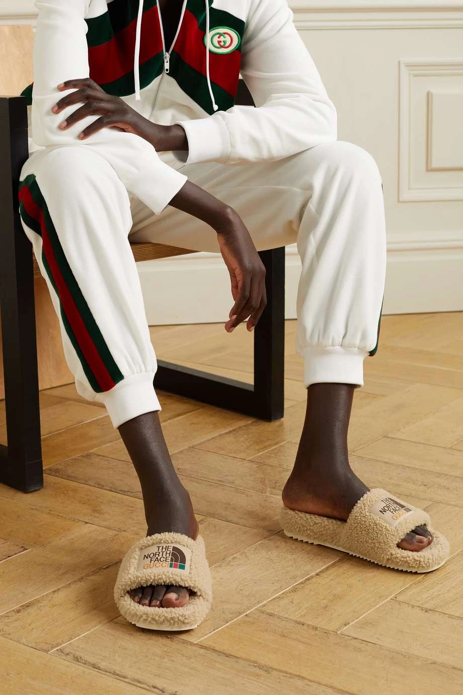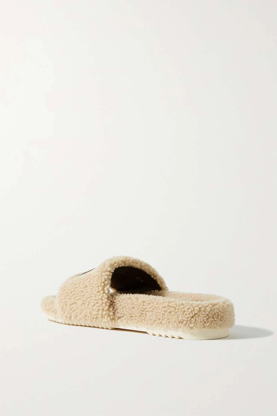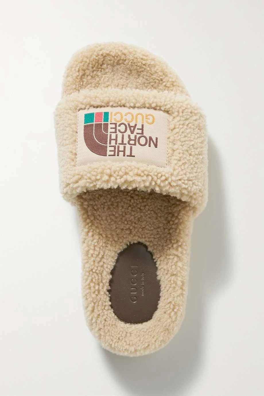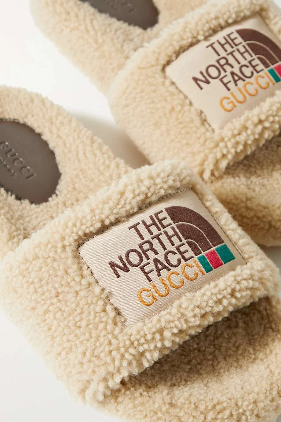 Diese Pantoletten stammen aus der Kollaboration von Gucci und The North Face, was sich auch an der Applikation mit den Logos beider Marken widerspiegelt. Das Paar wurde in Italien aus weichem Shearling gefertigt und mit einer Gummisohle gestaltet, weshalb es auch außer Haus getragen werden kann.
