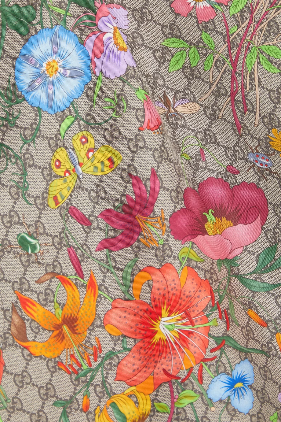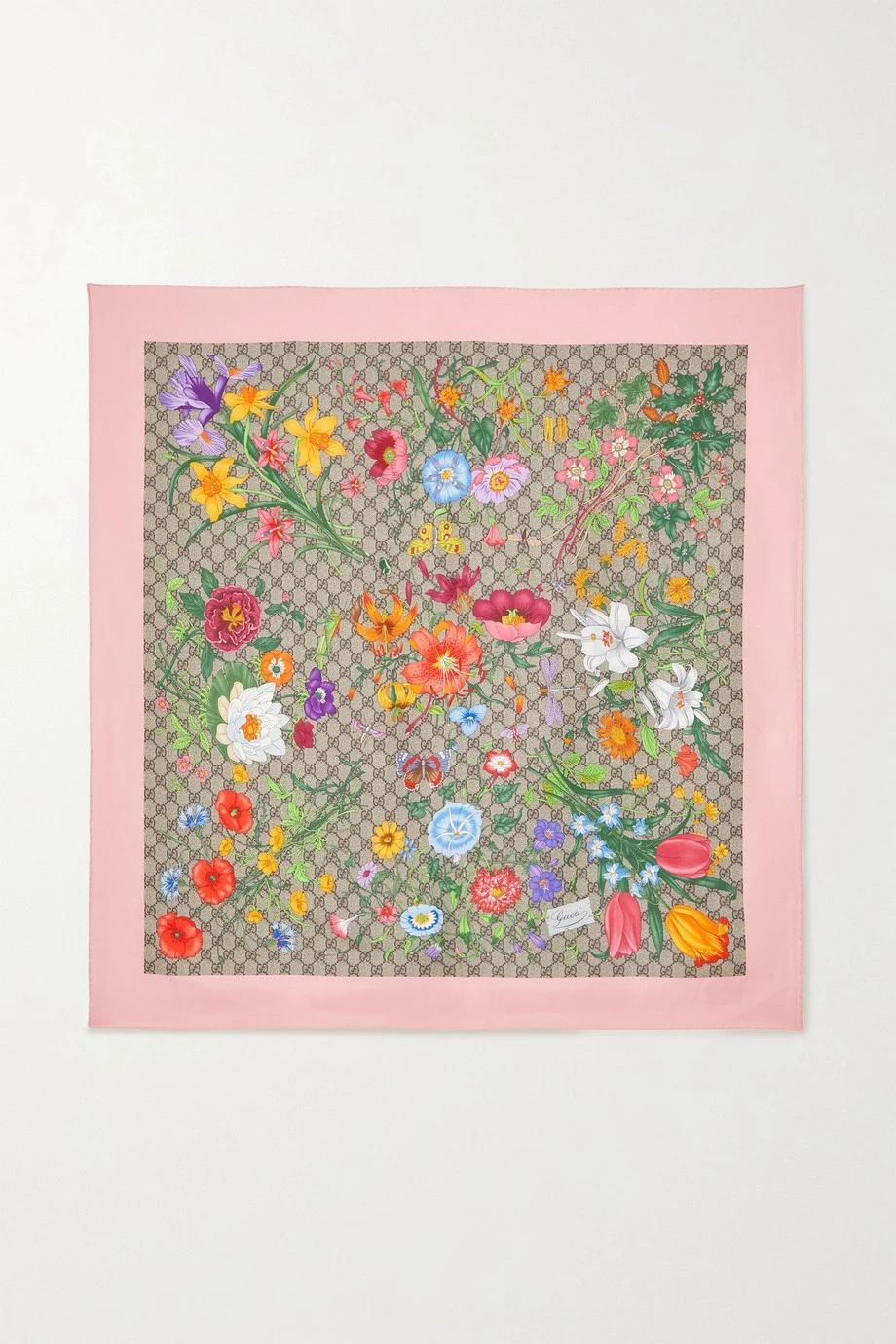 Dieses Tuch von Gucci ist an die „Flora“ Modelle der Marke aus den 60er-Jahren angelehnt, die von Vittorio Accornero entworfen wurden. Das in Italien gefertigte Accessoire besteht aus glänzendem Seiden-Twill, der mit dem „GG“-Logomuster und Vögeln sowie Blumen bedruckt ist.