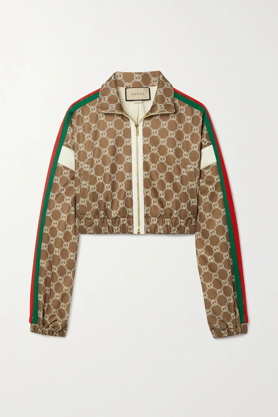 Diese Trainingsjacke von Gucci erinnert an Retro-Jogginganzüge, insbesondere wenn Sie die passende Hose dazu tragen. Das in Italien gefertigte Modell aus technischem Jersey zeigt sich mit einer neuen Version des unverkennbaren „GG“-Monogramms und hat einen leicht lockeren Schnitt mit einem elastischen Saum und den markentypischen Webstreifen in Rot und Grün entlang der Ärmel.