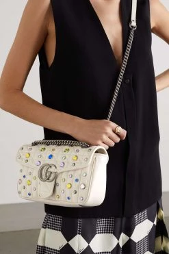 GUCCI GG Marmont 2.0 Kleine Schultertasche Aus Gestepptem Leder Mit Kristallen ,Weiß